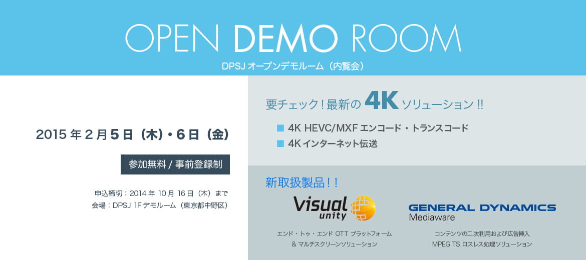 「DPSJ オープンデモルーム」(内覧会)を開催いたします。オープンデモルームは気軽に弊社のソリューションに触れていただける機会を提供すべく、デモルームを開放して自由に製品の機能や性能、使い勝手等を確認いただけるイベントです。Web やカタログでは中々確認できない機能や、配信サーバー等とのインテグレーション、製品の持つ実際の処理速度等をこの機会に体験してください。