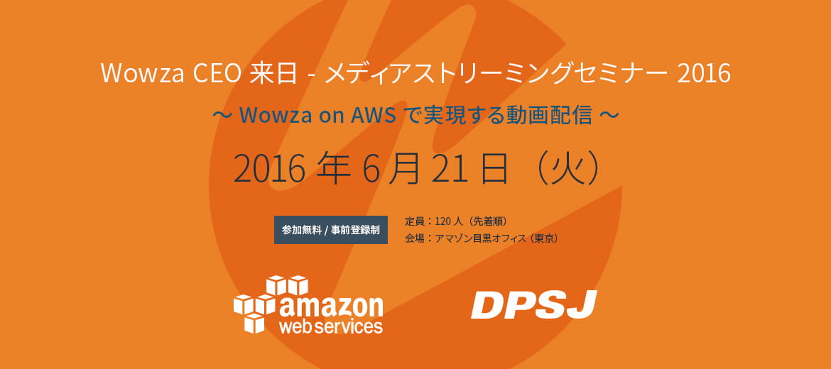 Wowza on AWS で実現する動画配信 昨年に引き続き、今年も Wowza 社からの来日に合わせ、セミナーを開催いたします。今年は共同創業者・CEO の Dave Stubenvoll が来日いたします。 Wowza は、VoD やライブでの動画配信に利用される動画ストリーミングサー...